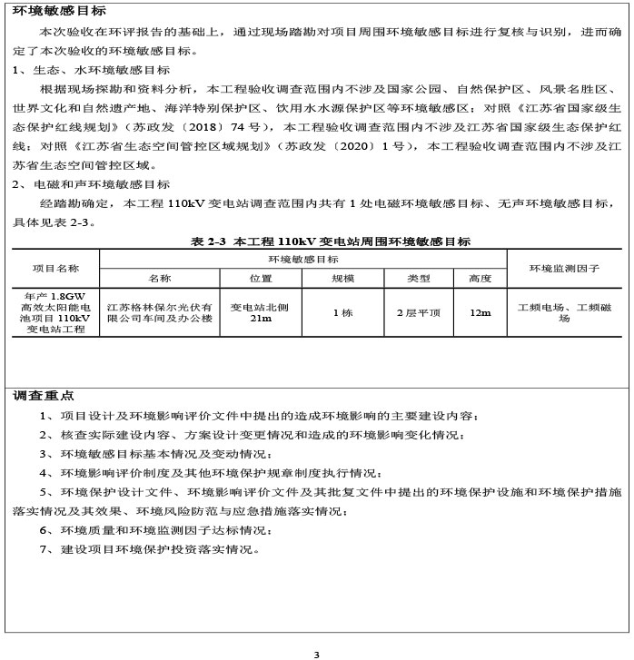江苏格林保尔光伏有限公司年产1.8GW高效太阳能电池项目110kV变电站工程环境保护设施设计单位为苏文电能科技股份有限公司,施工单位为常州润源电力建设有限公司。本工程环境保护设施于2021年11月竣工,并于2021年11月投入环保设施调试期。江苏格林保尔光伏有限公司于2021年12月24日在常州组织召开了江苏格林保尔光伏有限公司年产1.8GW高效太阳能电池项目110kV变电站工程竣工环保验收会,对本工程的环境保护设施进行了竣工环境保护验收,验收工作组同意该项目通过竣工环境保护验收。